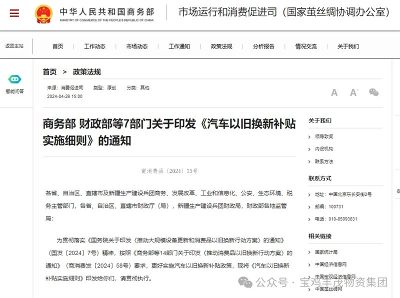 4月26日,商务部、财政部等7部门联合发布《汽车以旧换新补贴实施细则》(以下简称《实施细则》),落实《国务院关于印发〈推动大规模设备更新和消费品以旧换新行动方案〉的通知》(国发〔2024〕7号)精神,按照《商务部等14部门关于印发〈推动消费品以旧换新行动方案〉的通知》(商消费发〔2024〕58号)要求,更好实施汽车以旧换新补贴政策。具体内容如下: